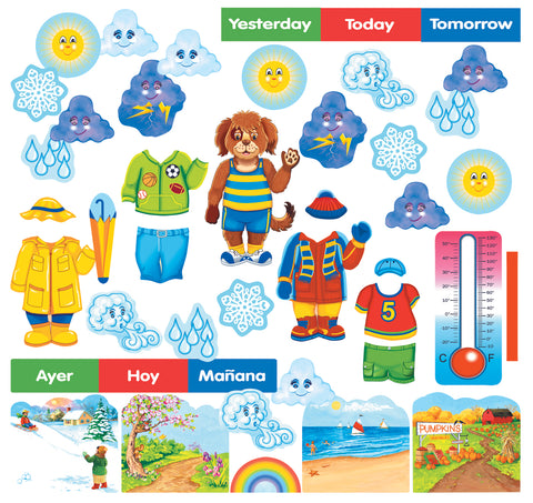 Discover a world of weather and how to dress for it. This set covers all your weather needs, from what kind of weather occurs during which season, and three days to track your weather: yesterday, today, and tomorrow.